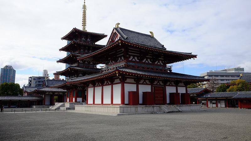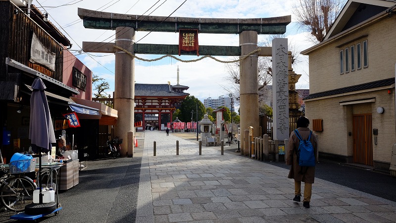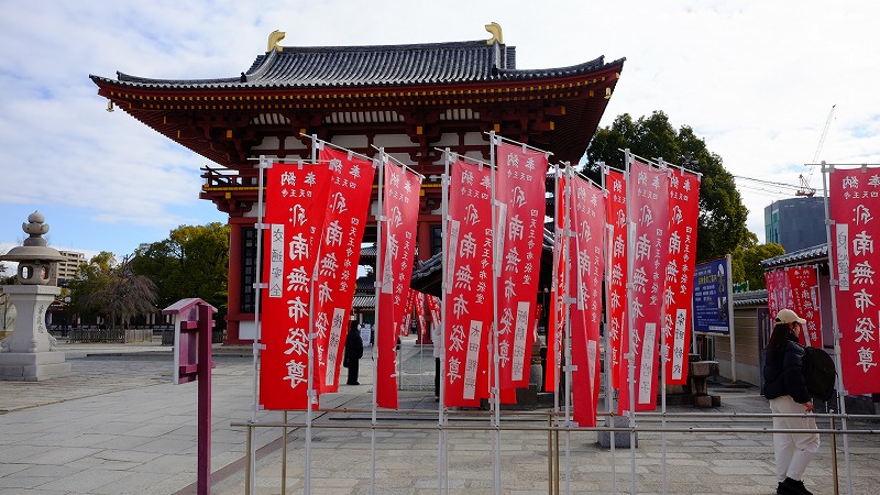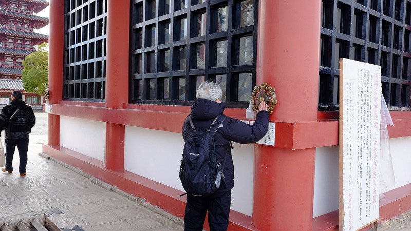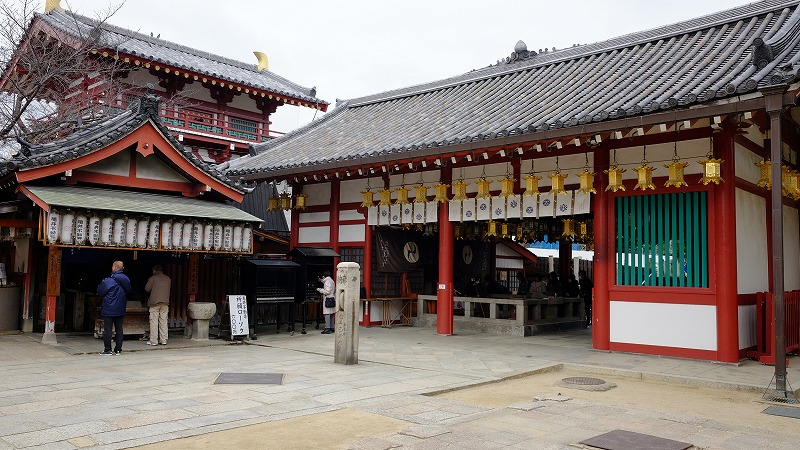 動物園前駅から一駅の王子駅までいき、そこから30分ほど歩いて聖徳太子建立の四天王寺に着く。 ビル街のど真ん中に別世界のように広大なお寺がある。 拝観料を払って中に入ると、昔のままではないにしろそれらしき建物群が整然とある。 釣り灯篭は見事な作りで、中心伽藍の仏像は威厳があり見ごたえがあった。 五重塔も螺旋階段で一番上まで登れ、見晴らしがよかったものの、もう一つでした。