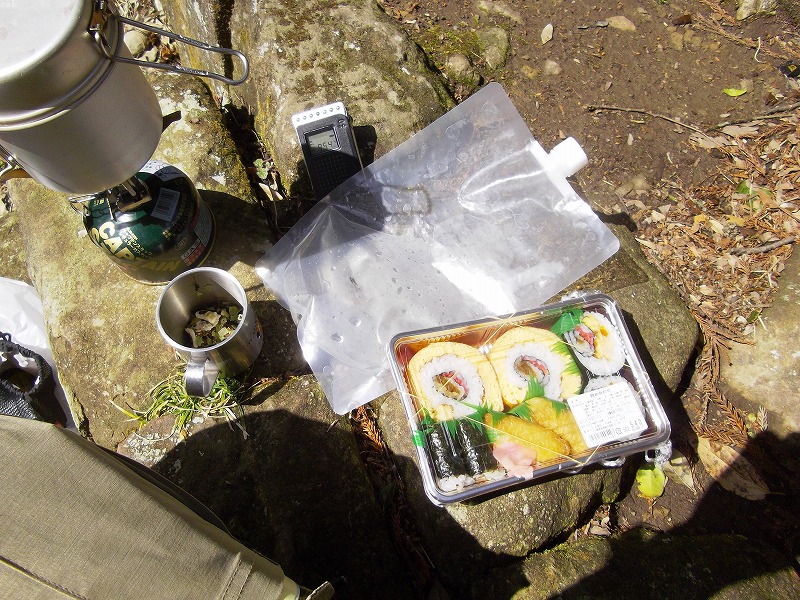 ここの展望は素晴らしく、遠く富士山もかすんではいたが見えました。昼食には少し早いので、南峯に向かいここで早めの昼食にした。 卵巻きセットは少々多すぎたのだが、それでもぺろっと食べてしまった。 下って車に着いたのは1時頃。 |